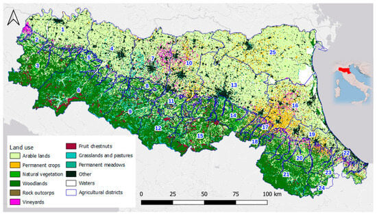 Figure 2 illustrates the dominant land uses in Emilia-Romagna [], highlighting the strong difference between the highly intensively cultivated plain and the extensively managed mountain rangelands and forests, which characterize 24 agricultural districts: nine in the alluvial plain, eight in the low Apennines (150–450 m a.s.l.), and eight in the medium (450–900 m a.s.l.) and high (>900 m a.s.l.) Apennines.