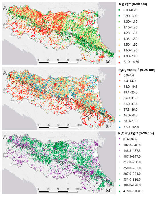 Classed post-plots of topsoil (0–30 cm) macronutrients’ concentrations: (a) N (g kg−1); (b) P2O5 (mg kg−1); (c) K2O (mg kg−1). Class intervals are defined based on the deciles of the observed distributions.