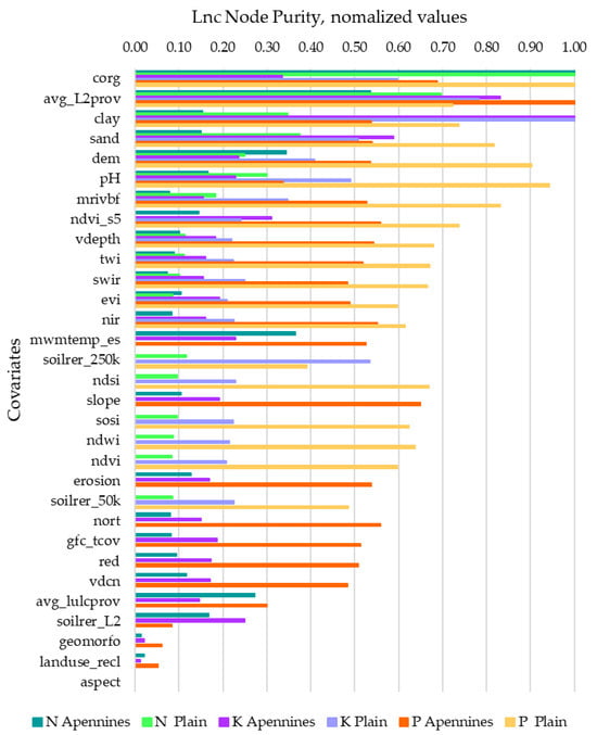 The DSM procedure allowed the identification of the covariates’ relevance in calibrating the QRF predictive models. Figure 4 shows the covariates’ importance in terms of node purity; the values shown in the figure were normalized to the same 0–1 range to plot together the three macronutrients considered in the two major landforms of RER.