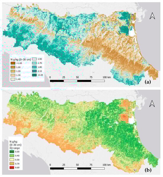 In terms of estimation uncertainties, the mean IQ range for the whole region is equal to 0.51 ± 0.34 g kg−1; the estimated N concentrations in the plain and in the lower Apennine are characterized by lower mean IQ values, equal respectively to 0.41 ± 0.18 g kg−1 and 0.40 ± 0.09 g kg−1. In the plain, the districts of Emilia have higher mean IQ range values than those of Romagna, with maximum values in Ferrara and Reggio-Emilia, respectively, at 0.57 ± 0.45 g kg−1 and 0.51 ± 0.12 g kg−1, and minimum values in the districts of Bologna and Ravenna, at 0.29 ± 0.03 and 0.31 ± 0.07 g kg−1, respectively. A very similar trend in spatial uncertainty of N concentration estimates is observed in the agricultural districts of the lower Apennine, with maximum mean IQ ranges found in Reggio-Emilia (0.54 ± 0.07 g kg−1) and Modena (0.41 ± 0.05 g kg−1) in Emilia, and minimum in the districts of Ravenna (0.29 ± 0.02 g kg−1) and Forlì (0.32 ± 0.03 g kg−1) in Romagna. In the agricultural districts of the mid- and high Apennines the mean values of the IQ range are always above the regional mean value, ranging between 0.55 ± 0.10 g kg−1 (Forlì district) and 0.72 ± 0.07 g kg−1 (Reggio-Emilia district) in the mid-Apennines and between 1.02 ± 0.18 g kg−1 (Modena district) and 1.69 ± 0.33 g kg−1 (Rimini district) in the high Apennines.
