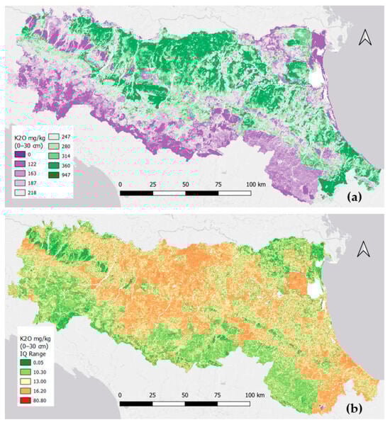 Figure 6 shows the estimated K concentrations, expressed as exchangeable potassium (K2O, mg kg−1), and its spatial uncertainty in terms of interquartile range.