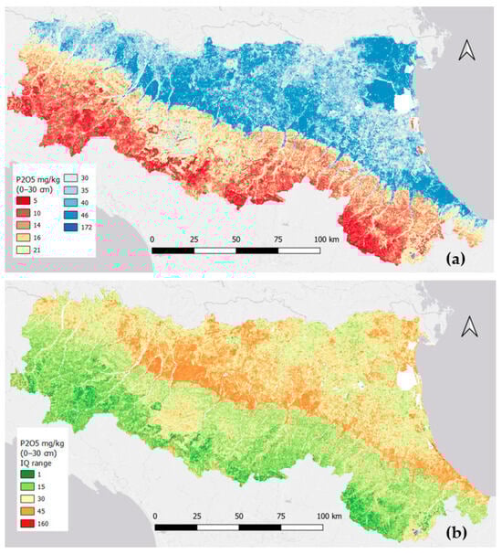 Figure 7 shows the estimated P concentrations, expressed as plant-available phosphorus (P2O5, mg kg−1), along with its spatial uncertainty in terms of interquartile range.