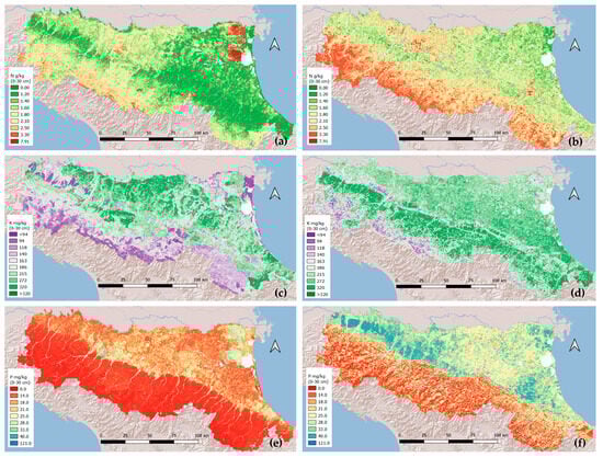 The goal of this work is to fill this knowledge gap by providing a high-resolution (100 m) assessment of topsoil macronutrients (N, P, and K) in Emilia-Romagna using a robust DSM approach based on a large regional soil database (N = 34,750). Our specific objectives are as follows: