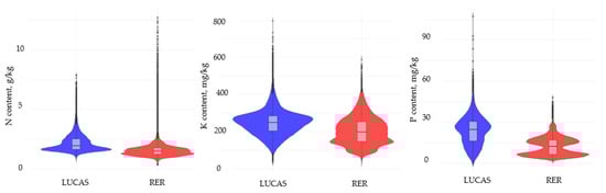 The resulting three macronutrients’ maps were postprocessed considering the 22 functionally distinct pedolandscapes based on the Emilia Romagna Soil Map at scale 1:1,000,000 [] and the 25 agricultural districts. In addition, the regional maps were compared with the topsoil nutrient status maps for the same area based on the 2009–2012 LUCAS dataset, which in Emilia-Romagna include 117 sampling points (density ~1.0 sample per 200 km2) where macronutrients’ content was analyzed following the ISO standards []. To this goal the maps were resampled and reprojected to the same resolution and reference system as the LUCAS maps, i.e., 250 m and EPSG:3035, using a bilinear interpolation algorithm in R. As in LUCAS maps K and P concentrations are given as mg kg−1, the regional estimates for exchangeable K and available P were multiplied by 0.830 and 0.436, respectively. Raster statistics were then computed, and macronutrient concentrations were compared in terms of agricultural districts and pedolandscapes. Figure S3 in the Supplementary Materials shows the location of the LUCAS points in the pedolandscapes of Emilia-Romagna.