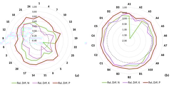 Macronutrient concentrations were assessed following the Italian official analytical methods [], which are coherent with ISO standards. In the case of nitrogen, the data refer to total content expressed in g kg−1, measured with the Kjeldahl method (ISO 1871:2009) [] or with the combustion method. The Olsen method (ISO 11263:1994) [] was used to determine plant available phosphorus, which is expressed as mg kg−1 P2O5. Exchangeable K2O content in soil was determined using the ammonium acetate method (ISO 22171:2023) [] and is expressed in milligrams per kilogram (mg kg−1) of soil.
