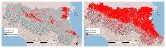 Figure 8 shows the maps of topsoil macronutrients based on the LUCAS survey data at the EU-scale for Emilia-Romagna, along with the corresponding maps based on regional data (RER maps). The original RER maps of the macronutrients’ content were resampled to match the 250 m resolution of the LUCAS maps; the classes in the legends of the six maps in Figure 8 are those of the LUCAS maps []. Table 4 summarizes the raster statistics for six maps, computed over the entire region and for the two major landforms. At the regional level, macronutrient contents based on LUCAS data resulted systematically above those based on the regional datasets, with a minimum average overestimation of 17.8% in the case of K concentration and a maximum of 48.1% in the case of P; the average overestimation for N concentration in the LUCAS map was equal to 26.2%. The degree of the overestimation observed for the LUCAS-based concentration maps was significantly different in the plain and in the Apennines: in the former it ranged from 7.0% for K concentration to 42.2% for P concentrations, while in the latter the corresponding figures were 29.3% and 59.9% for K and P concentrations, respectively. As for N concentrations, the LUCAS estimates were on average 13.4% and 36% higher than the RER estimates in the plain and the Apennines, respectively.