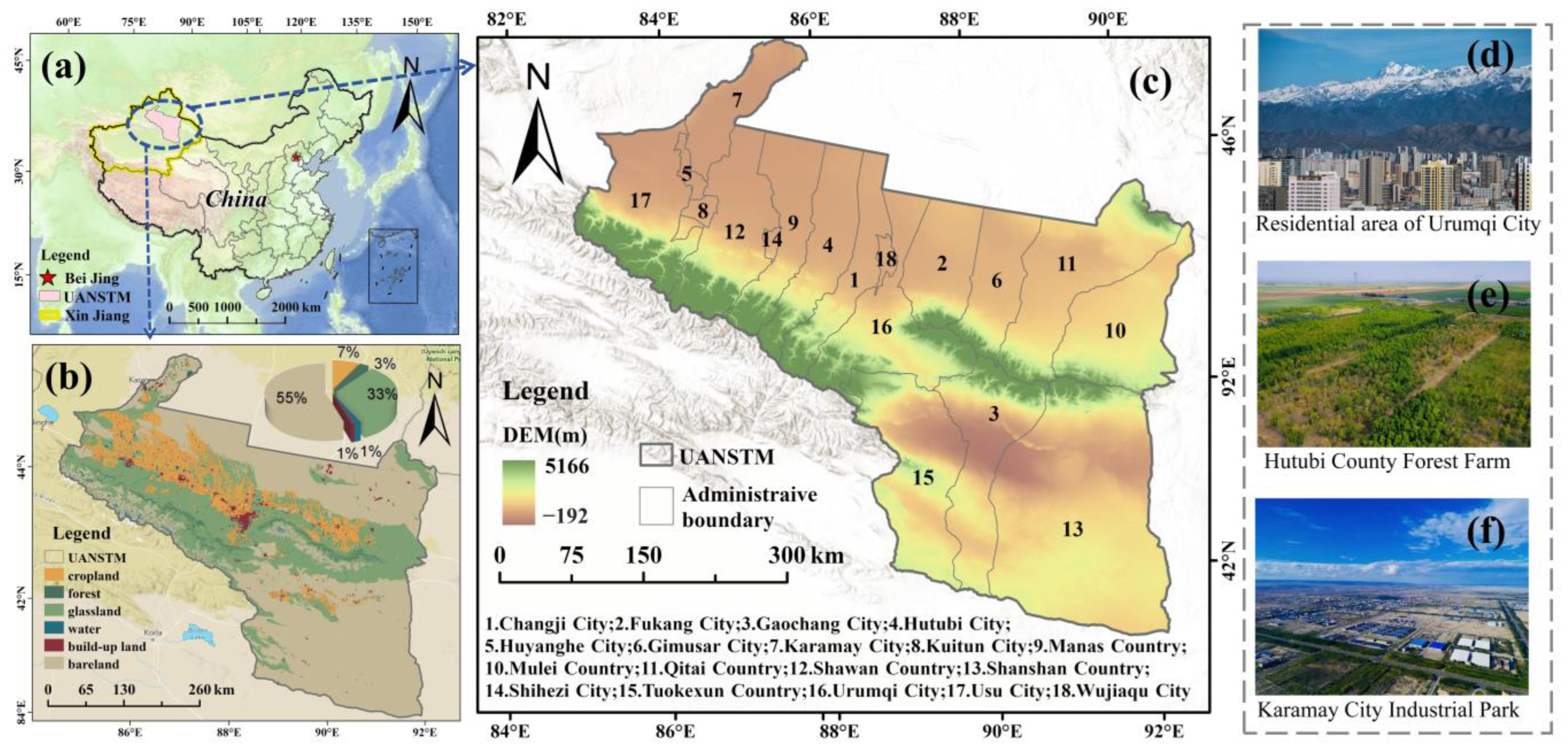 - Maimaiti, B.; Chen, S.; Kasimu, A.; Mamat, A.; Aierken, N.; Chen, Q. Coupling and Coordination Relationships between Urban Expansion and Ecosystem Service Value in Kashgar City. Remote Sens. 2022, 14, 2557. [Google Scholar] [CrossRef]