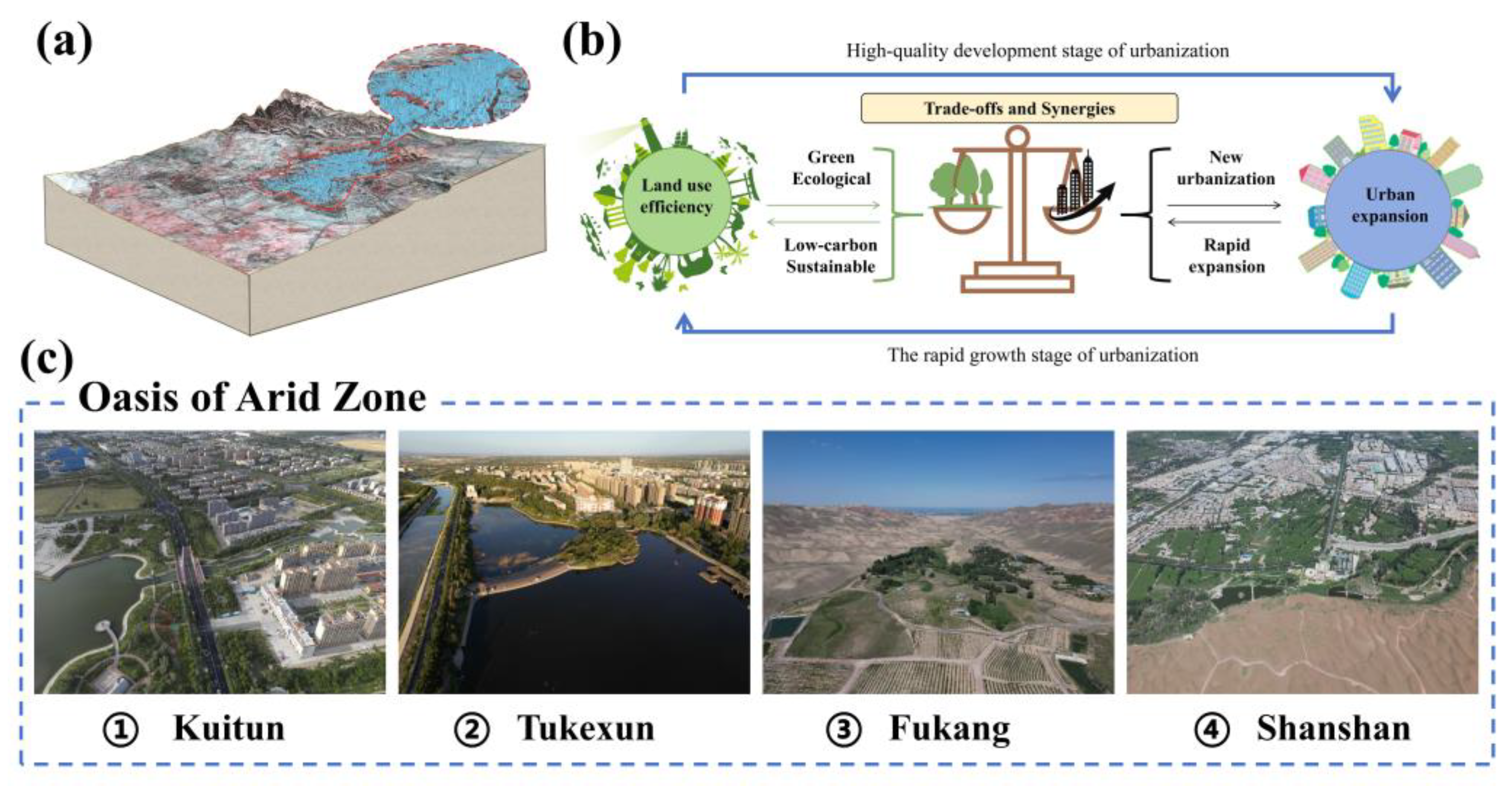 Zhang, Y.; Kasimu, A.; Zhang, X.; Song, N.; Shayiti, B.; An, X. Spatiotemporal Decoupling of Urban Expansion Intensity and Land Use Efficiency in Arid Oasis Agglomerations. Land 2025, 14, 2143. https://doi.org/10.3390/land14112143