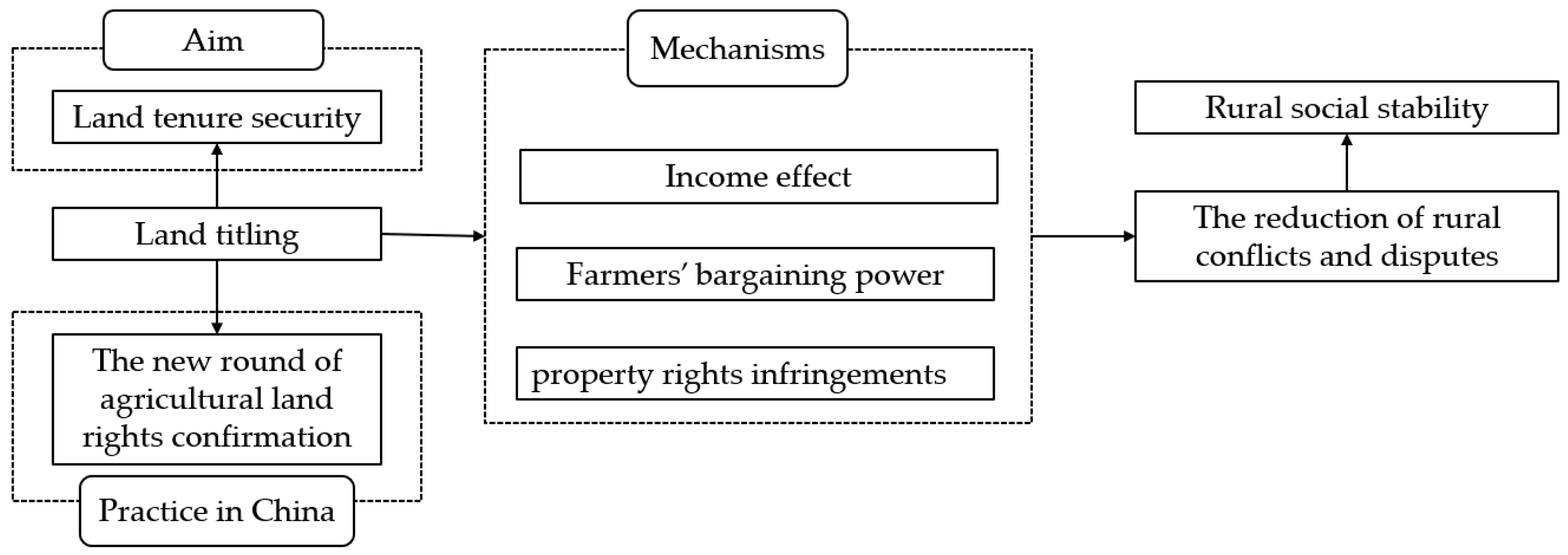 Drawing on the literature on property rights and rural conflicts and disputes, we construct a theoretical framework to clarify how the new round of agricultural land rights confirmation affects rural social stability (
