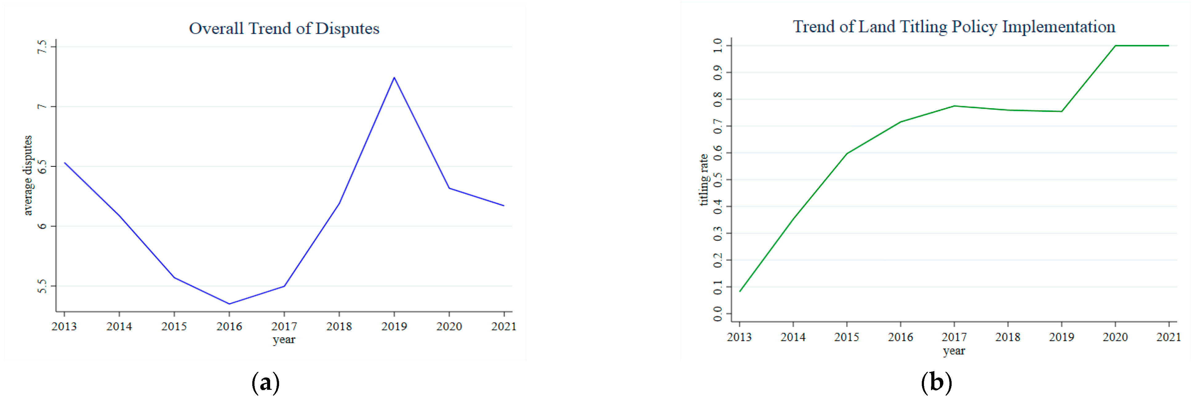 Figure 2b presents the cumulative implementation rate of the land titling policy, which rose over time and reached full coverage by 2020. Notably, the period of rising dispute levels—particularly between 2017 and 2019—coincides with slower policy expansion. This temporal alignment suggests that delays or uneven progress in policy implementation may have contributed to heightened social tensions, thereby providing preliminary motivation for the identification strategy developed in the following sections.