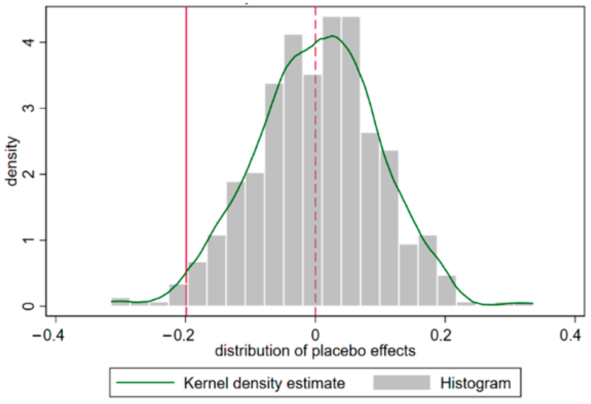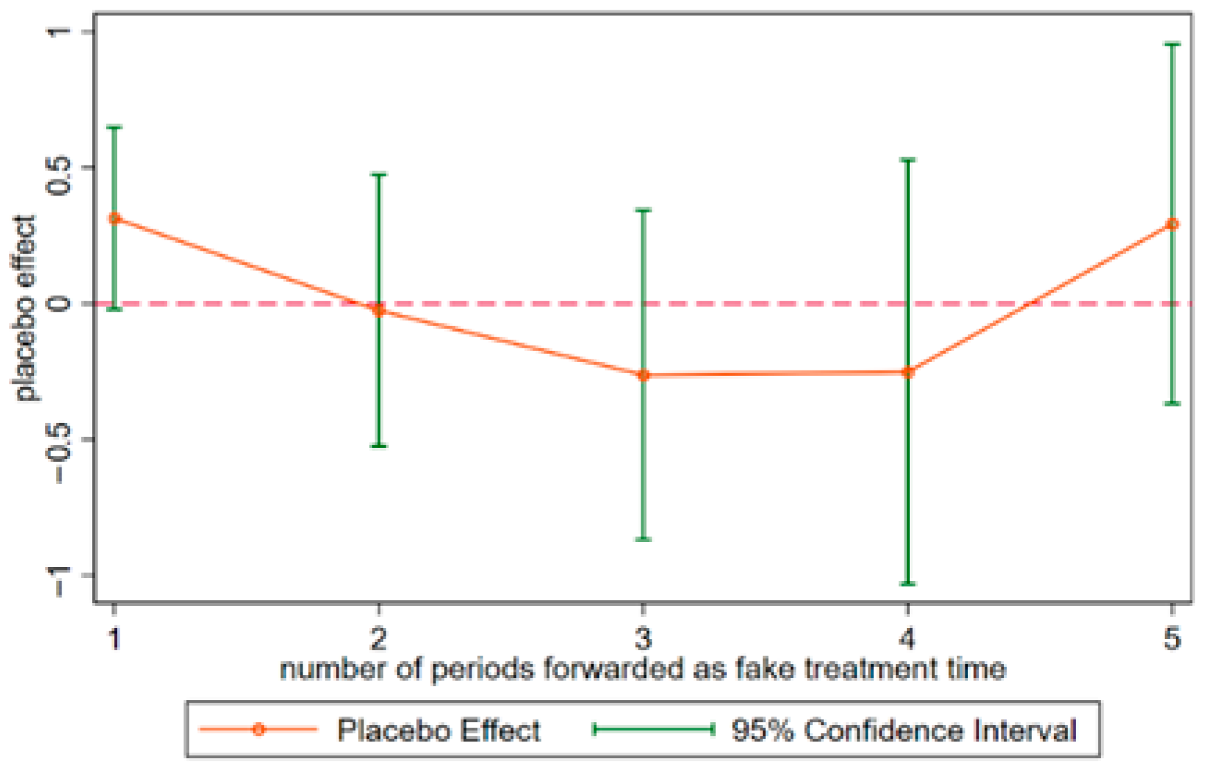 2. Placebo Tests. We perform placebo tests to rule out the possibility that the estimated effects are influenced by spurious correlations or time-varying confounders rather than the policy itself, following Chen et al. [