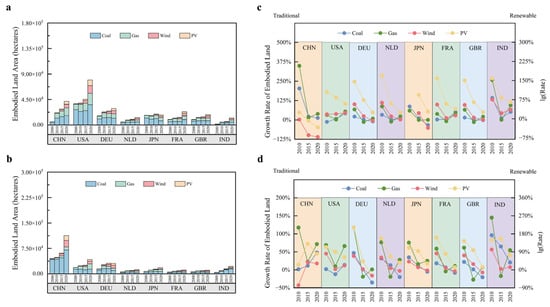 The growth rates of embodied land areas for different electricity generation types across countries over time were analyzed, as shown in Figure 3c,d. For imports, the growth rates of embodied land areas slowed over time in most countries, with slight rebounds in 2020, except for the United States and Japan. China and India experienced the most significant slowdowns in the growth rates of embodied land use from traditional energy sources. In China, the share of land use embodied in coal-fired power relative to total domestic electricity generation decreased from 2.03 times the 2010 level to just 0.13 times by 2020. Over the same period, India’s ratio declined from 1.42 to 0.52 times. Solar power related embodied land use growth rates declined more significantly than wind power. In France and India, the growth rate of wind-related embodied land rebounded in 2020, rising from 1.08 times and 1.66 times to 1.35 times and 2.30 times, respectively. The growth rate of wind power’s embodied land use in the United States increased steadily from 1.52 times in 2010 to 1.72 times in 2020, while that of solar power plummeted from 11.46 to 3.87 times. In Japan, the growth rates for wind and solar power related embodied land increased from −75.65% and 95.75% in 2010 to 1.67 and 8.67 times in 2015, fell again to 44.06% and 1.91 times in 2020.