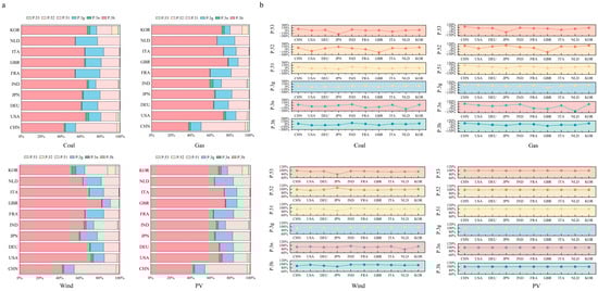 This study further investigates the sectoral structures of electricity-driven embodied land use from production and consumption perspectives. The results, as shown in Figure 6, reveal that, regardless of the country, the primary sources are household final consumption, government final consumption, and gross fixed capital formation. From Figure 6a, for coal-fired power, the household final consumption is the leading contributor to embodied land use in coal power across all countries, accounting for more than 43.37%. South Korea stands out with the highest impact, where household final consumption reached 66.91%. In France and Italy, government final consumption was the second-largest source, accounting for 24.82% and 18.98%, respectively. This indicates that the public sector plays a key role in electricity-driven embodied land use, likely due to government-led demand for public projects and services. In other countries, gross fixed capital formation was the second major source, with contributions exceeding 15.29%. The influence of other factors in these countries generally remained below 11.03%.