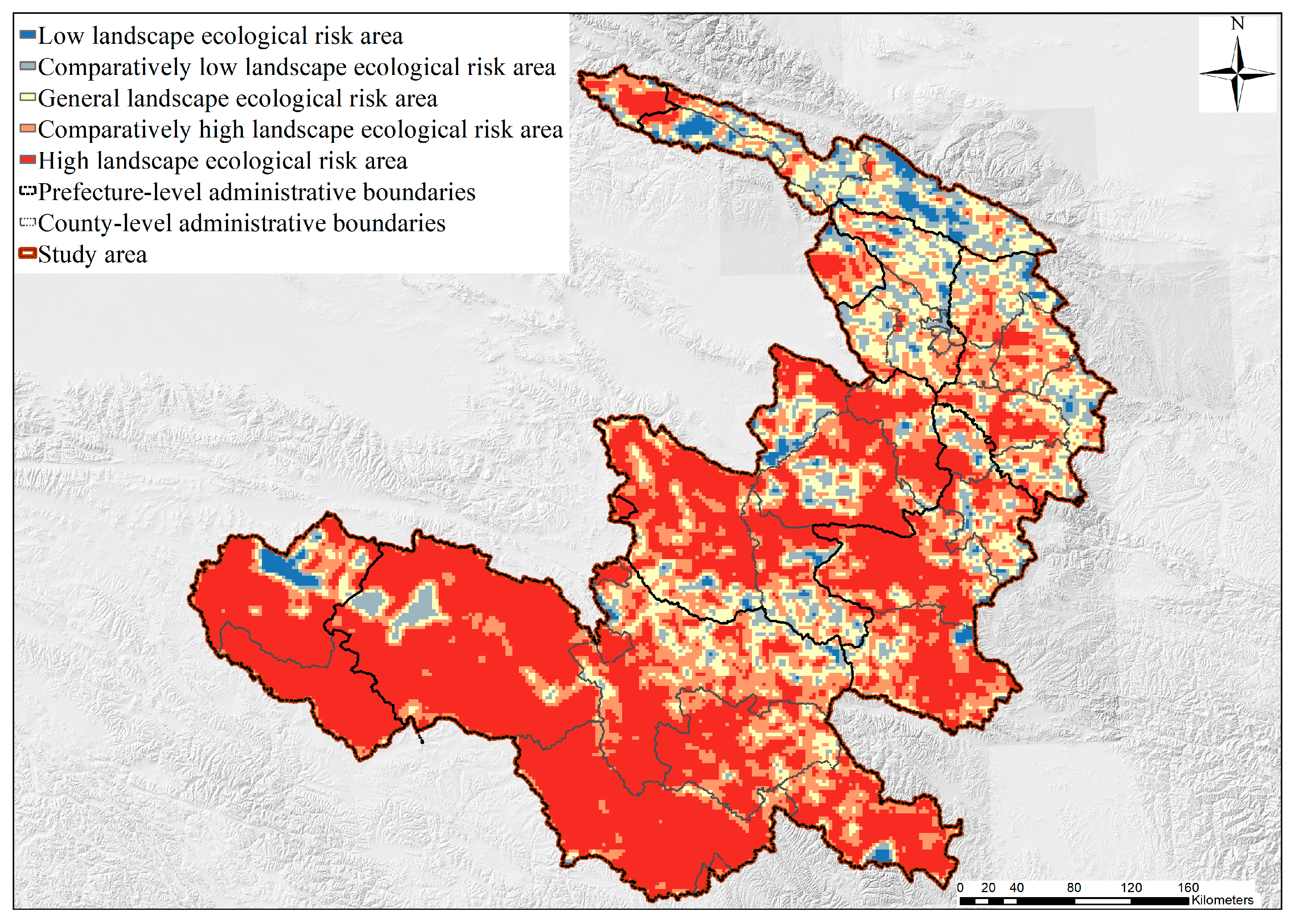 The Kriging interpolation method and the natural fracture method were used to classify the degree of landscape ecological risk in the study area into five levels: high, higher rea, general, lower, and low (shown in