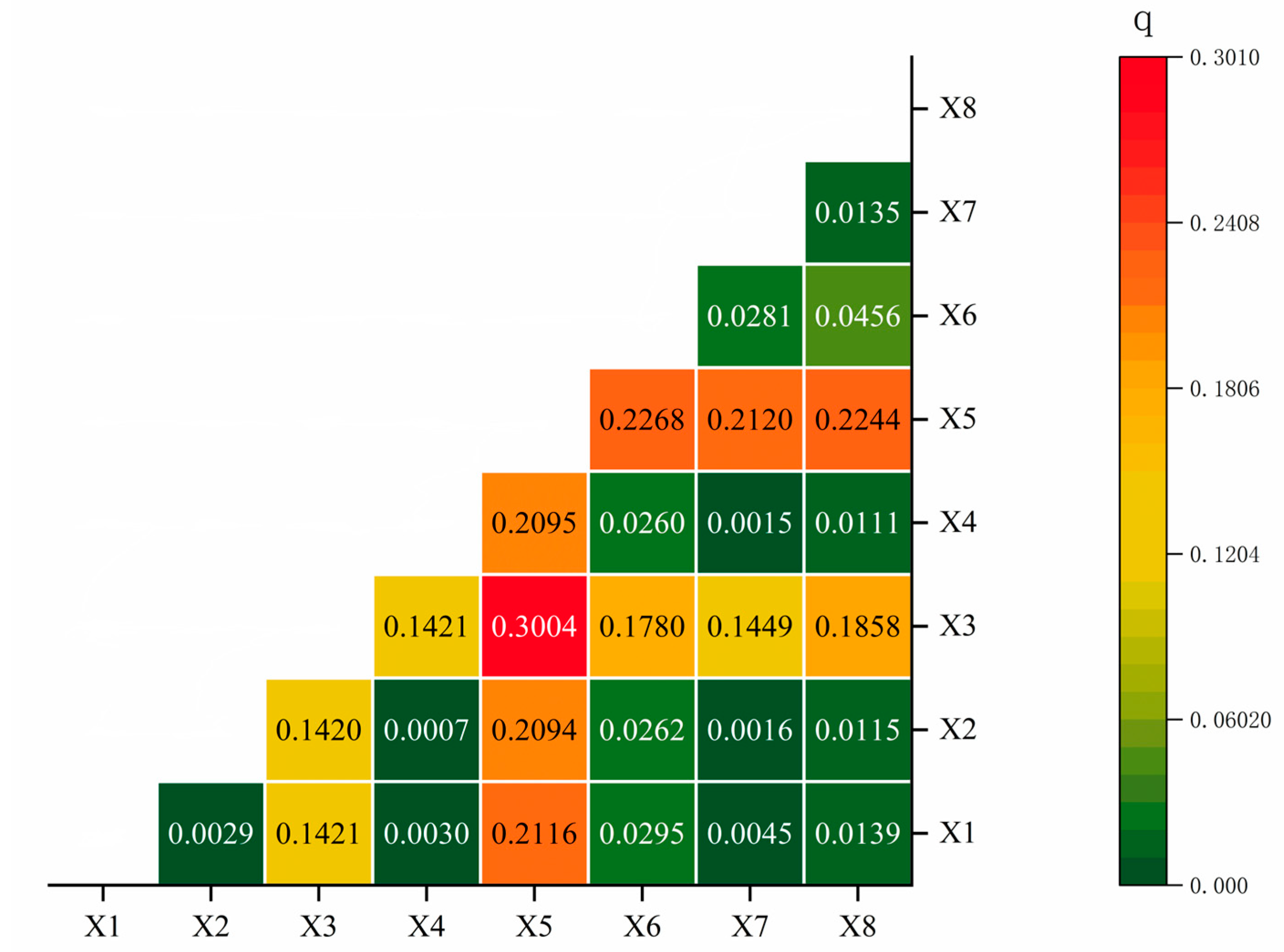 Figure 7, the q-values obtained from the pairwise interactions of the eight influencing factors all demonstrated a consistent increase compared to those of individual factors, indicating enhanced explanatory power through factor interactions. These enhanced effects were categorized into two primary types: “bifactor enhancement” and “nonlinear enhancement”. The most significant factor interaction for explaining the spatial heterogeneity of landscape ecological risk in the study area is the combination of “population density (X3)” + “habitat quality (X5)”, followed by the combinations of “habitat quality (X5)” + “vegetation coverage (X6)” and “habitat quality (X5)” + “river network density (X8)”. This indicates that habitat quality plays an especially prominent role in influencing the spatial distribution of landscape ecological risk. When combined with other factors—such as population density, vegetation coverage, river network density, and mining development intensity—it significantly enhances the explanatory power regarding spatial heterogeneity.