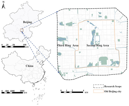 This study focuses on Beijing’s Third Ring Road area as the case study area (Figure 1). As China’s capital and political-cultural center, Beijing represents both a 3000-year urban development legacy and a contemporary showcase of China’s modernization. The city’s rapid urbanization has produced a distinctive urban morphology, characterized by the symbiotic coexistence of historic preservation and modern functional development [37]. The study area encompasses the principal section of Beijing’s “Capital Function Core Area” as defined in the Beijing Urban Master Plan (2016–2035), converging diverse URS typologies ranging from historically significant districts and ecological leisure zones to contemporary commercial hubs. The spatial concentration of resident daily activities and tourist recreational patterns within this area generates particularly rich social media data streams. This unique combination of spatial heterogeneity and behavioral data density makes the Third Ring Road an exemplary research setting for examining differential public perceptions of URSs in global megacities.
