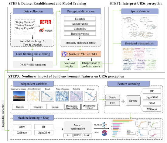 Despite these advancements, three critical research gaps remain. First, there is a notable lack of large vision–language models (LVLMs) specifically designed for multidimensional URS perception assessment. Owing to challenges in data acquisition and measurement complexity, current studies predominantly focus on isolated perceptual dimensions within specific types of spaces—such as parks, green spaces, or historic districts—and fail to establish comprehensive frameworks for systematic, multidimensional URS perception analysis. Furthermore, much of the existing literature relies on generic sentiment analysis APIs derived from natural language processing (NLP) platforms. While these models are optimized for general-purpose applications, they are ill-suited to capturing the subtle and context-dependent aspects of human perception [35]. As a result, the development of domain-specific annotation datasets and specialized deep learning architectures for multidimensional URS perception has been largely overlooked. Second, limited attention has been paid to explainability in identifying perceptual drivers. By examining environmental features that influence perceptual outcomes, many studies employ rudimentary text analysis techniques, such as high-frequency keyword extraction. This approach does not effectively capture contextual semantics, syntactic structures, or inter-word relationships, and is susceptible to irrelevant lexical interference, resulting in limited explanatory power. Explainable LVLMs present a promising alternative by enabling the simultaneous evaluation of perceptual dimensions and the generation of interpretable rationales, thus elucidating the underlying spatial characteristics that shape public perception. Nevertheless, few studies have investigated the integration of established public perception assessment frameworks with explainable LVLMs. Third, empirical research on the complex nonlinear relationships between public perception and environmental attributes remains insufficient. Most current approaches rely on correlation analyses and linear regression models, which are inherently constrained by their ability to capture nonlinear patterns and threshold effects [36]. Moreover, by focusing on data from discrete locations, these studies often overlook the broader urban spatial context and its influence on perceptual responses. Research employing interpretable machine learning methods—such as ensemble models combining Light Gradient Boosting Machine (LightGBM) and Random Forest (RF) with SHapley Additive exPlanations (SHAP) interpretation techniques—to investigate the intricate associations between environmental factors and public perception remains scarce.