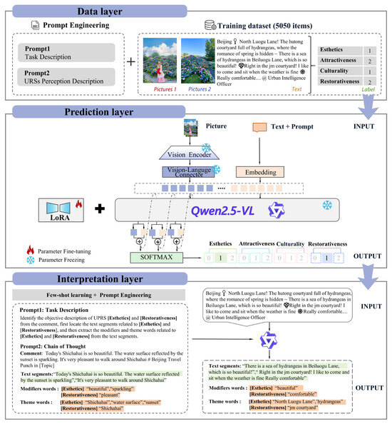 The architecture of Qwen2.5-VL-7B-SFT comprises three hierarchical layers: data layer, prediction layer, and interpretation layer (Figure 3). The data layer constructs model training inputs through systematic integration of the image–text dataset developed in Section 2.4.1 with carefully engineered prompts. These prompts guide the model to generate outputs meeting predefined quality standards. The prompt design in this layer incorporates two key components: a task definition, which specifies the model’s required computational tasks, and a perceptual feature definition, which provides descriptive guidance for target perceptual characteristics (more details in Appendix A).