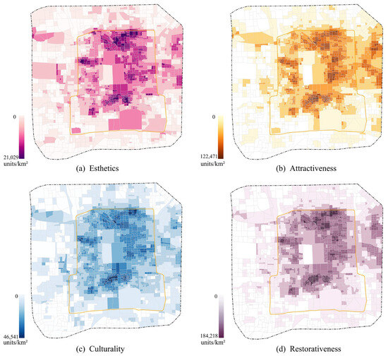 Figure 4 illustrates the block-scale spatial distribution patterns of positive evaluation density for the four perceptual dimensions through ArcGIS mapping. The esthetics and attractiveness dimensions exhibit significant spatial clustering. Their density peaks are strongly correlated with prominent historic districts such as Shichahai, Nanluoguxiang, and Dashilan. Notably, major urban open spaces, including Temple of Heaven Park and Yuyuantan Park, serve as focal points for esthetic perceptions. The attractiveness dimension forms dual cores in both the traditional commercial-tourism zone of Wangfujing-Qianmen and the modern consumption area of Sanlitun. In comparison, culturality and restorativeness display relatively uniform distributions within Beijing’s old city, and their spatial patterns closely correspond to traditional hutong network configurations. These findings collectively demonstrate that the old city functions as the primary spatial container for multidimensional perceptual values. Meanwhile, specialized urban functional zones and ecological-natural spaces create distinct spatial differentiation patterns across various perceptual dimensions.