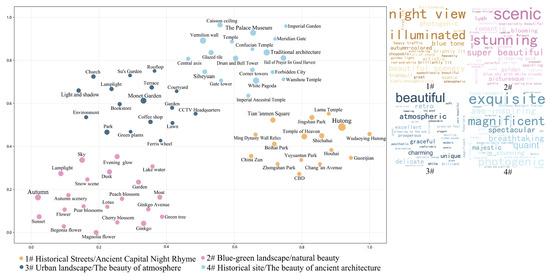 The esthetics dimension revealed four distinct clusters (Figure 5). Historic districts that present the ancient capital’s nocturnal charm, including “Shichahai”, “Wudaoying”, and “Guozijian” (Cluster #1), along with traditional architectural elements such as “vermilion wall”, “traditional architecture”, and “glazed tile” (Cluster #4), collectively demonstrated the dominant role of heritage-driven visual appreciation in esthetic perception. This form of appreciation stems from the historical sense and esthetic uniqueness conveyed by traditional neighborhoods and buildings that function as cultural symbols. Natural weather phenomena, including “sunset”, “evening glow”, and “dusk”, together with seasonal flora such as “ginkgo”, “magnolia”, and “peach blossoms” (Cluster #2), although not permanent built environment features, significantly enhanced esthetic experiences derived from urban blue–green infrastructure [47,48]. Furthermore, specific typologies of urban spaces represented by “Monet Garden”, “coffee shops”, and “terrace” (Cluster #3), frequently characterized as “atmospheric”, “beautiful”, and “charming”, indicate their significant potential for creating distinctive visual experiences. These spaces essentially represent a form of commercially curated visual consumption, catering to contemporary urban dwellers’ pursuit of heterogeneous and distinctive visual experiences.