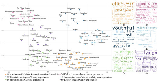 The attractiveness dimension revealed six distinct clusters (Figure 6). Modern consumption spaces with distinctive stylistic identities or functional attributes, including cultural venues offering “immersive” and “awe-inspiring” experiences (Cluster #2), “cafe shops”, “bookstores”, and “bars” described as “internet celebrity” or “industrial style” (Cluster #4), “gardens”, “malls”, and “hotels” characterized as “design-forward”, “large”, and “luxurious” (Cluster #6), and event-based elements or emerging entertainment spaces that create “joyful” and “youthful” experiences, such as “bazaar” and “talk shows” (Cluster #3) all effectively enhance venue attractiveness and stimulate exploration. The core appeal of these spaces lies in their ability to craft distinctive place imagery through strong stylistic identities or deeply engaging experiential programs, which effectively addressing younger audiences’ aspirations for self-expression and novel sensory engagement. Simultaneously, high-traffic areas such as “Sanlitun”, “Nanluoguxiang”, and “Houhai” (Cluster #1) attract crowds for “photo-taking” and “check-in” behaviors due to their social media propagation value. The act of checking in at these recognized “internet-famous landmarks” reflects both the public’s need for leisure experiences and daily enjoyment, as well as their desire for social recognition and inclusion within group practices [49]. Additionally, historic built environments that carry historical memories (Cluster #5), including “Siheyuan”, “drum and bell tower”, and the “church” described as “mysterious”, “antique”, or “magnificent”, become important sources of attractiveness by creating unique place imagery. These heterogeneous environments, which contrast markedly with contemporary urban routines, fulfill deep-seated psychological needs for exploration and nostalgia.