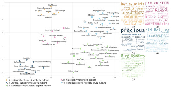 The culturality dimension identified five primary cultural sources and their spatial manifestations based on Chen et al.’s [12] cultural cognition framework for Beijing’s historic urban areas (Figure 7). Among these, Beijing-style culture (Cluster #4) predominantly manifested in the historical street network texture, and ancient capital culture (Cluster #5), represented by historical relics such as “temples”, “central axis”, and “former residences”, constitute significant sources of culturality. Both are rooted in the city’s long historical accumulation and regional characteristics, forming the core of local identity. Celebrity culture (Cluster #1), associated with historical figures such as “Mei Lanfang”, “Lao She”, and “Li Dazhao”, has established a more emotionally warm cultural connection by concretizing abstract history into vivid character narratives and relying on their former activity sites. This cultural form is often closely intertwined with historical evaluations and collective memories such as “loyal spirit”, “reputation”, and “humiliation”. Furthermore, Red culture (Cluster #2), centered on national symbols such as the “Great Hall of the People”, the “Five-Star Red Flag”, and “flag-raising ceremonies”, evokes transcendent collective emotions and national identity through the sublime nature of its political landmarks and ritual activities. These experiences are frequently expressed through terms like “prosperity”, “greatness”, and “pride”. Meanwhile, innovative culture (Cluster #3), characterized by “intangible cultural heritage”, “exhibitions”, and “museums”, provides a contemporary interpretation and display of traditional cultural resources. Thereby, it enables the public to gain systematic cultural cognition through evaluations such as “precious”, “artistic”, and “profound”.