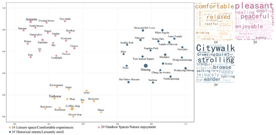 The restorativeness dimension identified three characteristic clusters (Figure 8). Commercial spaces, including “coffee shops”, “bars”, and “terraces” (Cluster #1), function as “third places” by providing comfortable and secure environments, enabling individuals to obtain social support and stress relief through activities described as “chatting”, “gathering”, and “drinking”. Outdoor environments comprising physical spaces such as “rooftops”, “courtyards”, and “gardens” and integrated with natural elements like “autumn”, “sunshine”, and “breeze” (Cluster #2) create tranquil, relaxing, and psychologically safe settings through their open and bright vistas. These environments are posited to reduce cognitive load, thereby enhancing psychological restorativeness [23], and frequently evoke emotional experiences described as “pleasant”, “romantic”, and “peaceful”. Furthermore, in areas such as historical alleys and heritage parks (Cluster #3), terms such as “Citywalk”, “strolling”, “leisurely”, and “quiet” are frequently mentioned. This pattern suggests a tendency among participants to establish a positive interaction between physical activity and mental wandering through walking. This process allows for them to perceive and understand the city’s cultural heritage, artistic ambiance, and daily life scenes in a more relaxed state.