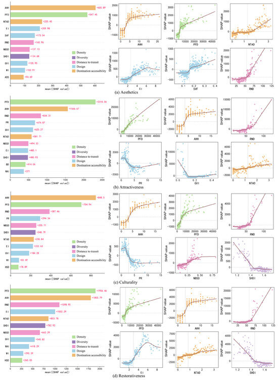 SHAP analysis was employed to quantify the contribution of various built environment characteristics to each perceptual dimension (Figure 9). For esthetics, AHH and PFD demonstrated the highest importance, followed by NTAD and EI. Attractiveness was primarily governed by PFD, with secondary influences from AHH, RND, and PR. Culturality showed a similar pattern to esthetics, dominated by AHH and PFD but supplemented by RND and PR. Restorativeness maintained PFD and AHH as predominant factors while incorporating significant contributions from RND and EI. To characterize these nonlinear relationships, we implemented SHAP dependence plots with Locally Weighted Scatterplot Smoothing curves for enhanced interpretation.