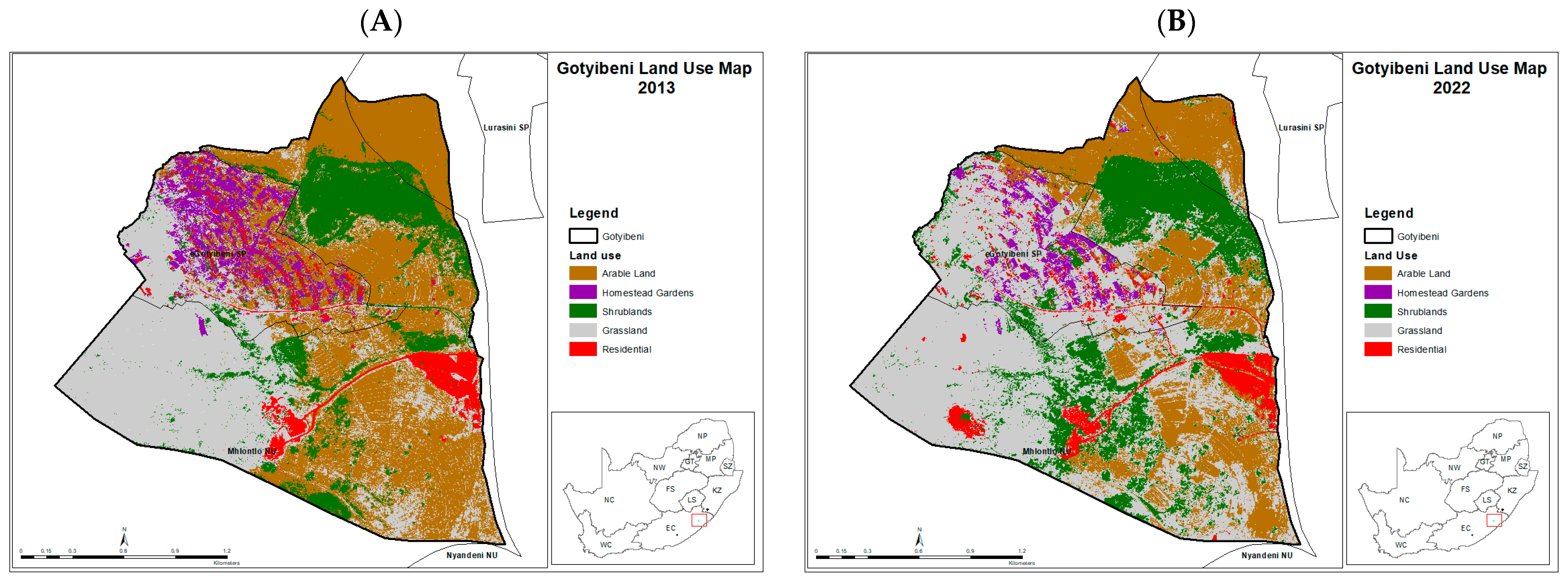 - Musetsho, K.D.; Chitakira, M.; Nel, W. Mapping land-use/land-cover change in a critical biodiversity area of South Africa. Int. J. Environ. Res. Public Health 2021, 18, 10164. [Google Scholar] [CrossRef] [PubMed]