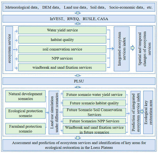 The Loess Plateau is one of the typical regions with prominent global ecological and environmental problems. Its unique topography, climate and long-term unreasonable land use make it one of the most serious soil erosion areas in the world [7]. Large-scale soil erosion and vegetation degradation not only lead to the continuous decline of ecosystem service supply capacity in the Loess Plateau but also affect the ecosystem security and socio-economic development of the lower Yellow River Basin [8]. Large-scale soil erosion and vegetation degradation not only lead to the continuous decline of ecosystem service supply capacity in the Loess Plateau but also affect the ecosystem security and socio-economic development of the lower Yellow River Basin [9]. In recent years, the Chinese government has implemented a series of ecological restoration projects. These measures have achieved certain results in improving the regional ecological environment, but they also face the unclear spatial and temporal evolution of ecosystem services. In the future, the changes in ecosystem services in different scenarios are unknown, and the identification of key areas for ecological restoration lacks scientific methods. In some areas, there is a phenomenon of excessive or insufficient restoration, resulting in waste of resources and ecological functions that are not expected. Therefore, scientifically identifying key areas of ecosystem services and formulating targeted ecological restoration strategies are important prerequisites for achieving ecological security in the Loess Plateau [10].