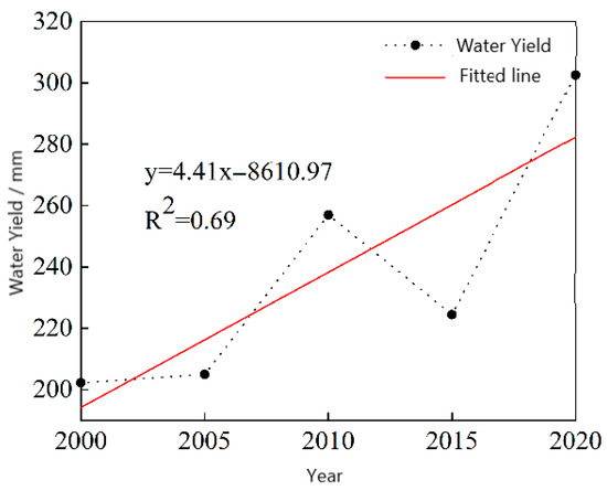 The average annual water yield of the Loess Plateau from 2000 to 2020 was calculated by ArcGIS software, and the average annual water yield of the Loess Plateau in 2000, 2005, 2010, 2015 and 2020 was 202.25 mm, 204.99 mm, 256.99 mm, 224.48 mm and 302.57 mm. Origin was used for linear fitting to plot the temporal trend of annual average water yield on the Loess Plateau from 2000 to 2020. The results show that the water yield on the Loess Plateau from 2000 to 2020 showed an overall upward trend, and the annual average water yield increased at a rate of 4.41 mm. The annual average water yield in 2000 was the lowest, and the annual average water yield in 2020 is the highest (Figure 3).