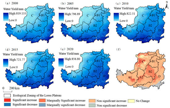 (a–e) Spatial distribution of water yield on the Loess Plateau from 2000 to 2020; (f) Spatial trend of water yield on the Loess Plateau from 2000 to 2020.