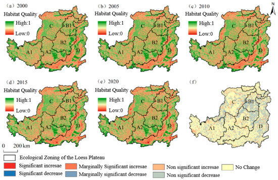 (a–e) Spatial distribution of habitat quality on the Loess Plateau from 2000 to 2020; (f) Spatial Trend of Habitat Quality on the Loess Plateau from 2000 to 2020.