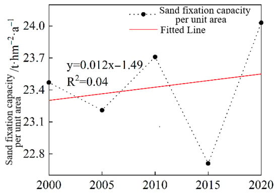 Temporal variation of sand fixation per unit area on the Loess Plateau from 2000 to 2020.