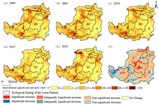 (a–e) Spatial distribution of sand fixation per unit area on the Loess Plateau from 2000 to 2020; (f) Spatial trend of sand fixation per unit area on the Loess Plateau from 2000 to 2020.