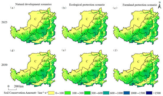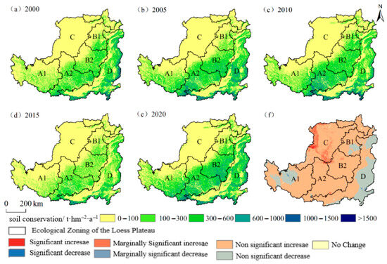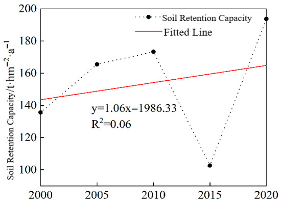 The soil conservation capacity in the Loess Plateau was calculated using the Revised Universal Soil Loss Equation (RUSLE) model for the period 2000–2020, followed by statistical analysis of the soil retention data using ArcGIS software. The results indicate (Figure 9) that the Loess Plateau experienced an overall increase in trend in soil conservation capacity from 2000 to 2020, with the mean annual soil retention rate per unit area showing a significant increase of 1.06 t·hm−2·a−1, In 2015, the annual average of soil conservation per unit area was the lowest, which was 102.67 t·hm−2·a−1, and in 2020, the highest annual average soil conservation per unit area was 193.73 t·hm−2·a−1.