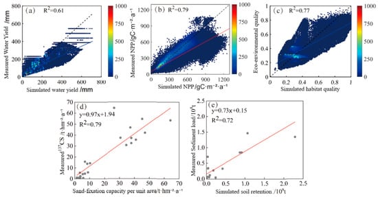 In order to verify the simulation results of the ecosystem service model, this study will use the water production and habitat quality results simulated by the InVEST model and the NPP data simulated by the CASA model to compare with the spatial distribution of global land water production year by year, the historical high-resolution ecological environment quality data set of China, and the net primary productivity data set of China’s MOD17A3H vegetation fitting MATLAB R2022b software is used to pixel–level pair the calculated ecosystem service simulation values with existing product data sets. 137CS tracer technology is a commonly used method to verify the accuracy of the RWEQ model in simulating soil wind erosion [40]. In order to verify the accuracy of the RWEQ model in soil wind erosion simulation on the Loess Plateau, the 137CS tracer technology is commonly used to verify the accuracy of the RWEQ model in soil wind erosion simulation on the Loess Plateau. In this study, by searching in the literature [40,41], 23 sets of 137CS tracer measurement data from different locations and years were collected. Origin 2021 software was used to linearly fit these data with the simulation results of the RWEQ model in this study to verify the accuracy of the windproof and sand-trapping service estimation results. In order to verify the accuracy of the RUSLE model in the soil retention simulation of the Loess Plateau, Origin software is used to linearly fit the results of the RUSLE model with the sand transport volume of the Loess Plateau hydrological site to verify the accuracy of the soil retention estimation results.