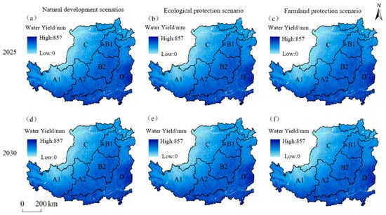 From 2000 to 2020, the spatial distribution pattern of water yield on the Loess Plateau was relatively similar, showing a decreasing trend from Southeast to Northwest, with the areas with high water yield mainly distributed in A1, A2, B1, B2 and D, and the areas with low water yield mainly distributed in C. the spatial variation of water yield on the Loess Plateau mainly showed a slight and non-significant increase in trend (Figure 4f), accounting for 82.93% of the study area, and the slightly significant increase in area was mainly distributed in B2 area, accounting for 19.91% of the study area. Areas with a slight and significant decrease in water yield were mainly distributed at the Northwest end of A1 and the South end of the D zone, accounting for 6.61% of the study area. The unchanged areas were mainly distributed in sub-district C, accounting for 7.04% of the study area.