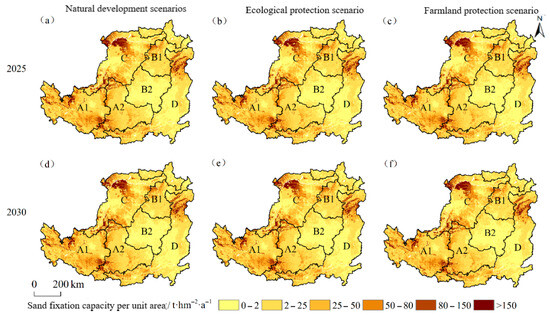 From 2000 to 2020, the Loess Plateau exhibited a distinct Northwest–Southeast gradient in sand fixation capacity per unit area, with higher values predominantly clustered in subregions A1, B1, and C, while lower values were mainly concentrated in subregions A2, B2, and D. From 2000 to 2020, the spatial distribution of sand fixation capacity changes in the Loess Plateau (Figure 8f) shows, areas with non-significant increasing trends accounted for 29.55% of the study area, mainly in subregions B1, B2 and C. Areas with marginally and significantly increasing in trends covered 4.74%, primarily at the boundary between subregions C and B2. Areas with non-significant decreasing trends comprised 46.98%, mostly in subregions A1, A2, and D.