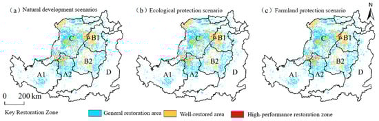 At present, the main methods for identifying key areas of ecological restoration can be divided into three categories [11]: The first method establishes an ecological restoration pattern by analyzing the background of natural resources and combining regional characteristics. The second method uses the index system method to evaluate ecological health [12], ecological security [13], and ecological service function [14]. Key indicators (such as vegetation cover, climate, landscape pattern index, and ecological service function) were selected to delineate ecological restoration areas [15]. The third is based on the theory of the ecological security pattern. By identifying ‘ecological source-resistance surface-ecological corridors, ecological obstacle points and ecological pinch points are identified as key restoration nodes [16]. Among the three methods, the most commonly used are ecological health evaluation, ecological service function evaluation and ecological security pattern method based on an index system. Ecological health assessment is mainly used to measure the structural and functional stability of ecosystems and is an effective means to identify damaged areas [17]. The commonly used Pressure-State-Response (PSR) model has the characteristics of systematization and clear causal logic. It can reveal the relationships among various ecosystem elements and is widely used across many evaluation fields, such as ecological health, risk, and sensitivity [5]. Its advantage is that the method has clear logic and high flexibility [18], but it has high scientific requirements for the selection of indicators. Improper indicators may affect the accuracy of evaluation [19]. Ecological service function evaluation focuses on various direct or indirect benefits provided by ecosystems to human beings and plays a key role in the relationship between ecosystems and social well-being [4]. The InVEST model has the characteristics of high precision, a wide application range and easy data acquisition. It can present multiple ecological service functions and predict future trends at the spatial scale [20]. By analyzing the supply-and-demand relationship of ecological service functions and the coordination and balance of key nodes [21], the contradiction between supply and demand of ecological functions can be avoided, and the construction of a security pattern can be promoted [22]. By identifying the degraded and damaged areas of ecological functions, key restoration targets can be more clearly identified, but the mutual constraints between various ecological service functions and the impact of external disturbances still need to be considered. The ecological security pattern method emphasizes the connectivity of ecosystem structure and process [23]. This method is derived from research on the protection of biological habitats and migration corridors. Tools such as the minimum resistance model and circuit theory are often used to simulate the minimum-cost path of species migration or ecological flow diffusion to determine ecological corridors and key nodes. However, this method cannot fully consider the interference of external factors such as climate change and human activities [24]. In addition, traditional ecological restoration strategies usually lack dynamic simulation of future scenarios, and it is difficult to provide long-term and forward-looking guidance for regional ecological management [25].