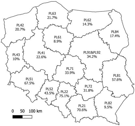 Coverage of local spatial development plans in force in Poland as for NUTS2 level (the codes in the figure represent the NUTS2 region classifications for Poland).