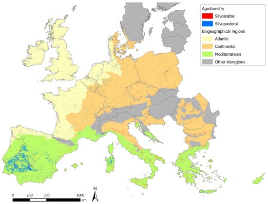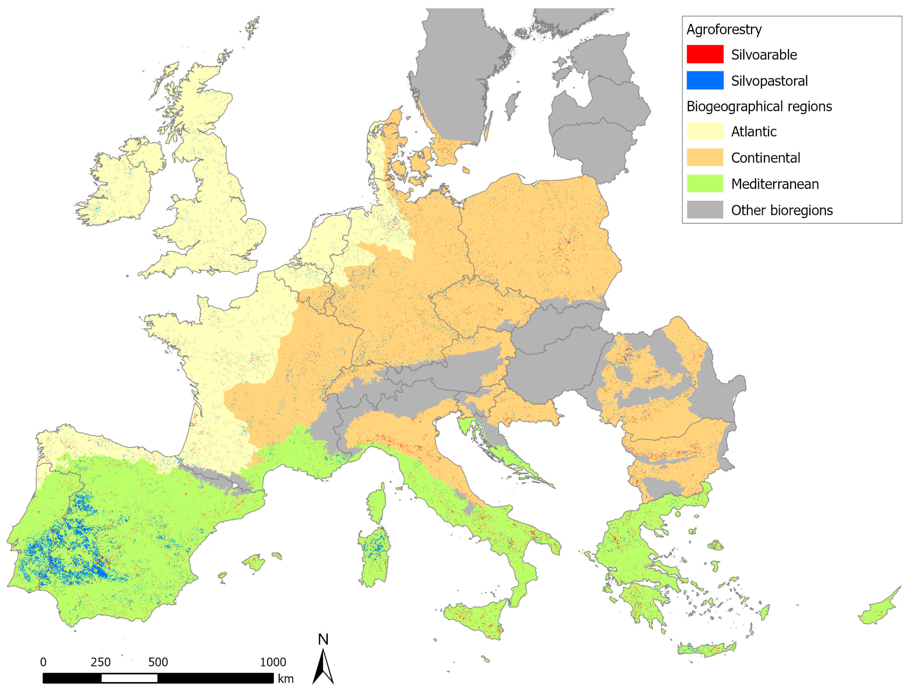 The main novelty of this article lies in its spatially explicit assessment of the extent, distribution, and climate mitigation potential of silvopastoral and silvoarable agroforestry systems across the EU27, UK, and Switzerland, with a particular focus on the Atlantic, Continental, and Mediterranean biogeographical regions. Unlike previous studies, such as those using the LUCAS dataset [