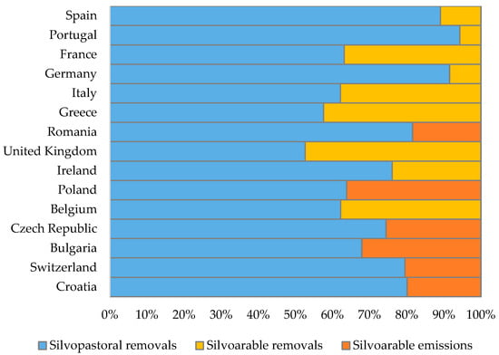 45]. In terms of removal contributions in relation to agroforestry areas of individual countries, countries such as Italy, Bulgaria, Lithuania and Poland contributed with high a proportion of agroforestry area but with less mitigative effort due to the use of relatively low removal rates and much larger areas of these countries fall within Mediterranean biogeographical region, which has reported lower removals rates for the analysed trees. This is due primarily to low tree densities and younger trees. On the other hand, other states, i.e., Spain, the UK, France, and Belgium, attributed a higher removal proportion than their respective areas. This is the result of higher removal rates, especially within silvopastoral systems. In terms of emissions proportions in relation to the areas, no variation was reported. This is due to the pretty consistent emission rates for both studied land use systems used across the countries and regions. Subsequently, this has resulted in higher net positive removals in relation to the proportion of the area in cases, i.e., Belgium, Ireland, Spain, and the UK.