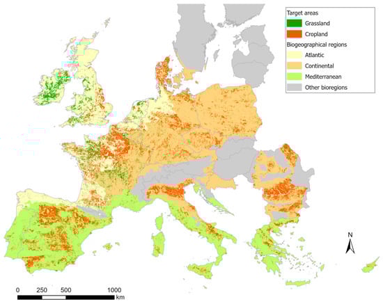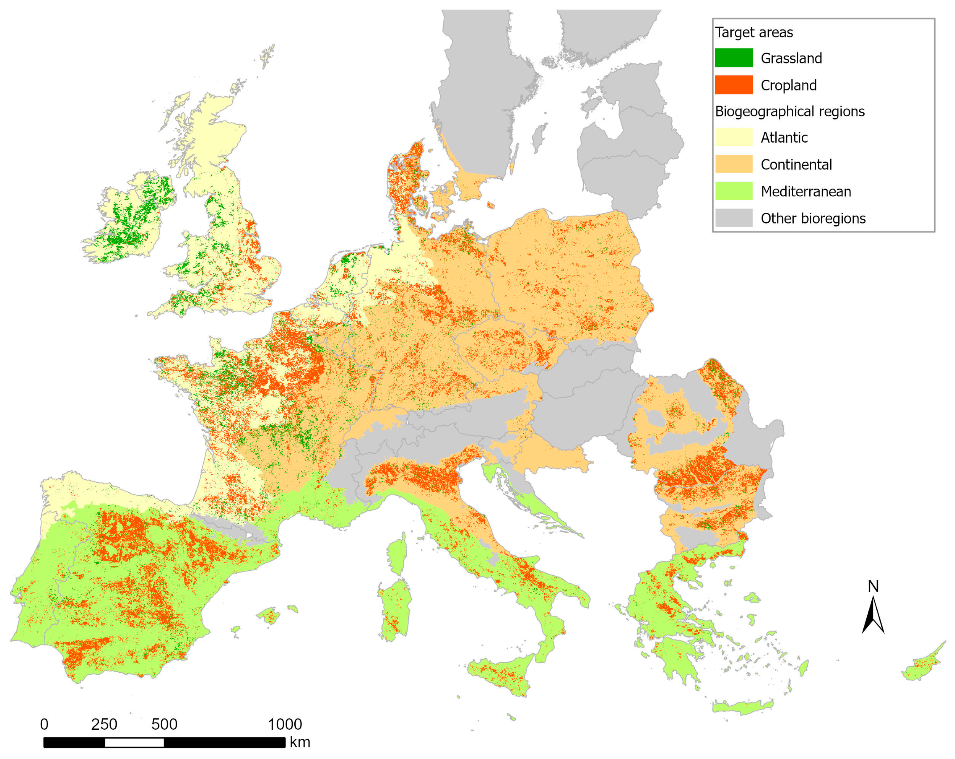 Figure 6 shows the spatial distribution of target areas within EU3B in cropland and grassland areas, and