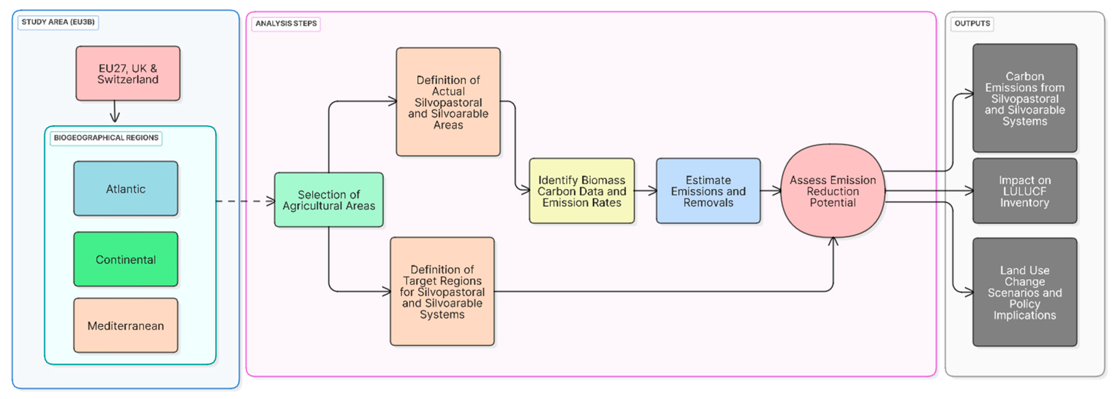Figure 2): (1) identifying silvopastoral and silvoarable areas within the EU27, UK, and CH, focusing on the Atlantic, Continental, and Mediterranean biogeographical regions; (2) compiling biomass carbon data and emission factors associated with various management practices; (3) estimating greenhouse gas emissions and carbon removals from the identified silvopastoral and silvoarable areas; and (4) simulating land use change scenarios, defining target areas for the introduction of these agroforestry systems to evaluate their potential contribution to emission reductions within the LULUCF sector. This comprehensive methodology resulted in the creation of an inventory of emissions and removals for silvopastoral and silvoarable systems, an assessment of their potential impact on the LULUCF inventory, and the proposal of policy-relevant land use change scenarios. Furthermore, all spatial and geostatistical analyses were conducted using ArcGIS Pro (v3.1.0).