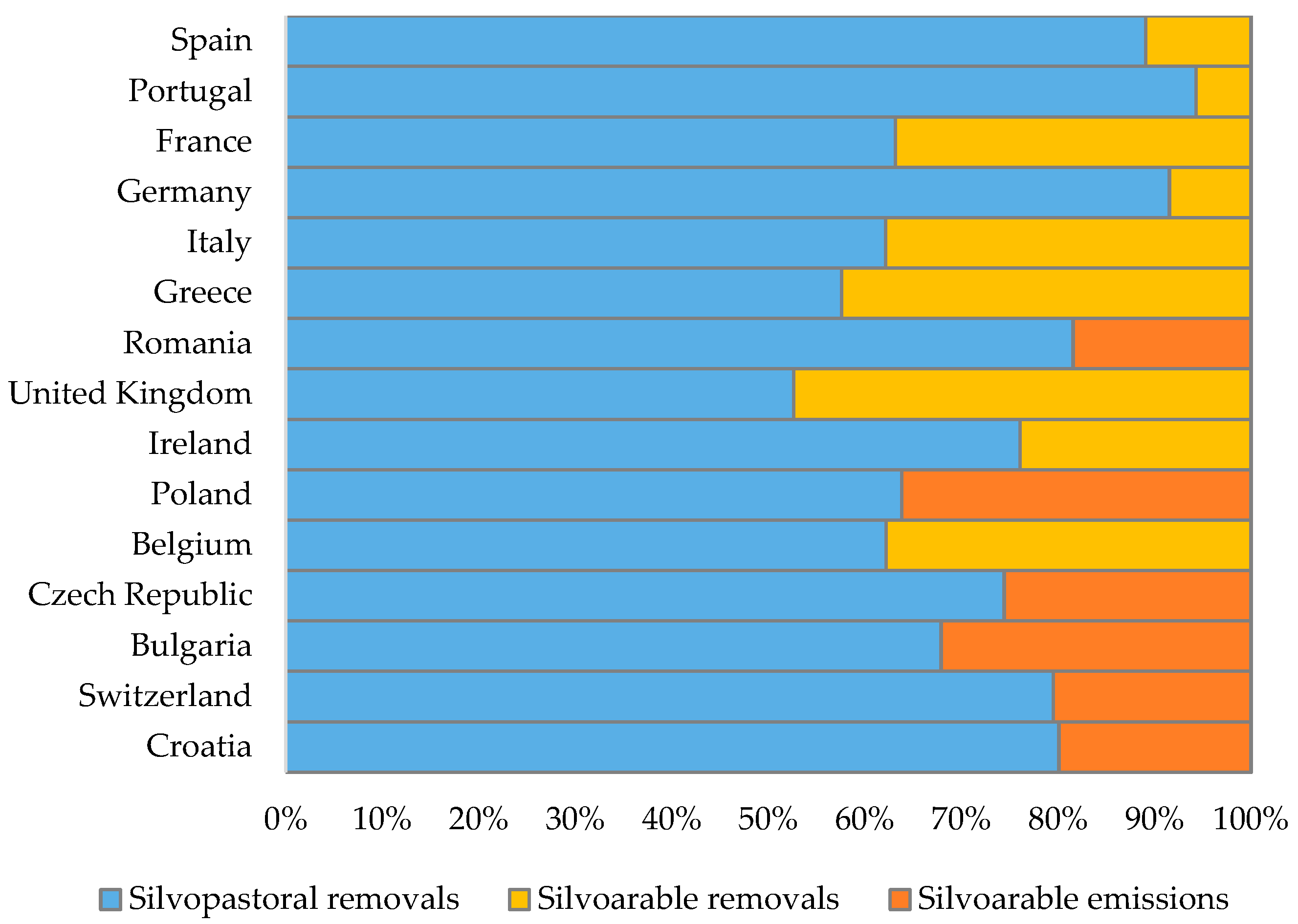 2 eq or 11% is contributed by silvoarable systems. Although contributing less to overall net emissions than silvopastoral systems, these systems in countries like Spain and Portugal still have noteworthy carbon sequestration. Additionally, in Spain, Germany, Portugal, and France, their removals outweigh their emissions and thus are the largest contributors to removals, playing a significant role in achieving the overall reductions. However, in the cases of Austria, Bulgaria, and Croatia, the silvoarable areas indicated positive net emissions, highlighting that their removals are less than the emissions. Furthermore, several states have demonstrated substantial contributions when it comes to silvopastoral areas. Spain leads with 43.4% of the total due to its larger areas, followed by Portugal (11.3%), Germany (8.9%), France (7.1%), and Italy (5.1%). However, smaller contributions are attributed to states such as Cyprus, Luxembourg, and Slovenia. Other states, e.g., Estonia, recorded zero net emissions in this land use category, highlighting their lack of contributions.