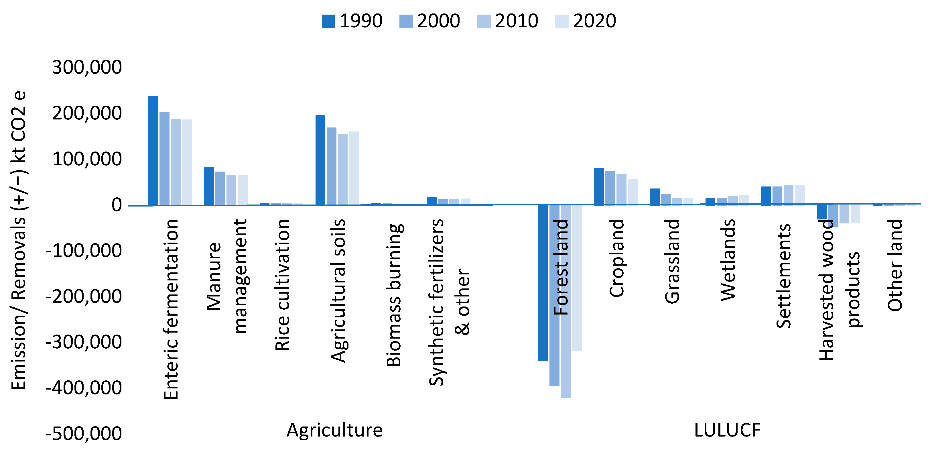 −1. Out of that, only around 8% or 0.2 billion comes from both the agriculture and LULUCF (AFOLU) sectors combined. The LULUCF sector alone, which includes six categories, contributes with net removals of around −239.44 Mt t CO