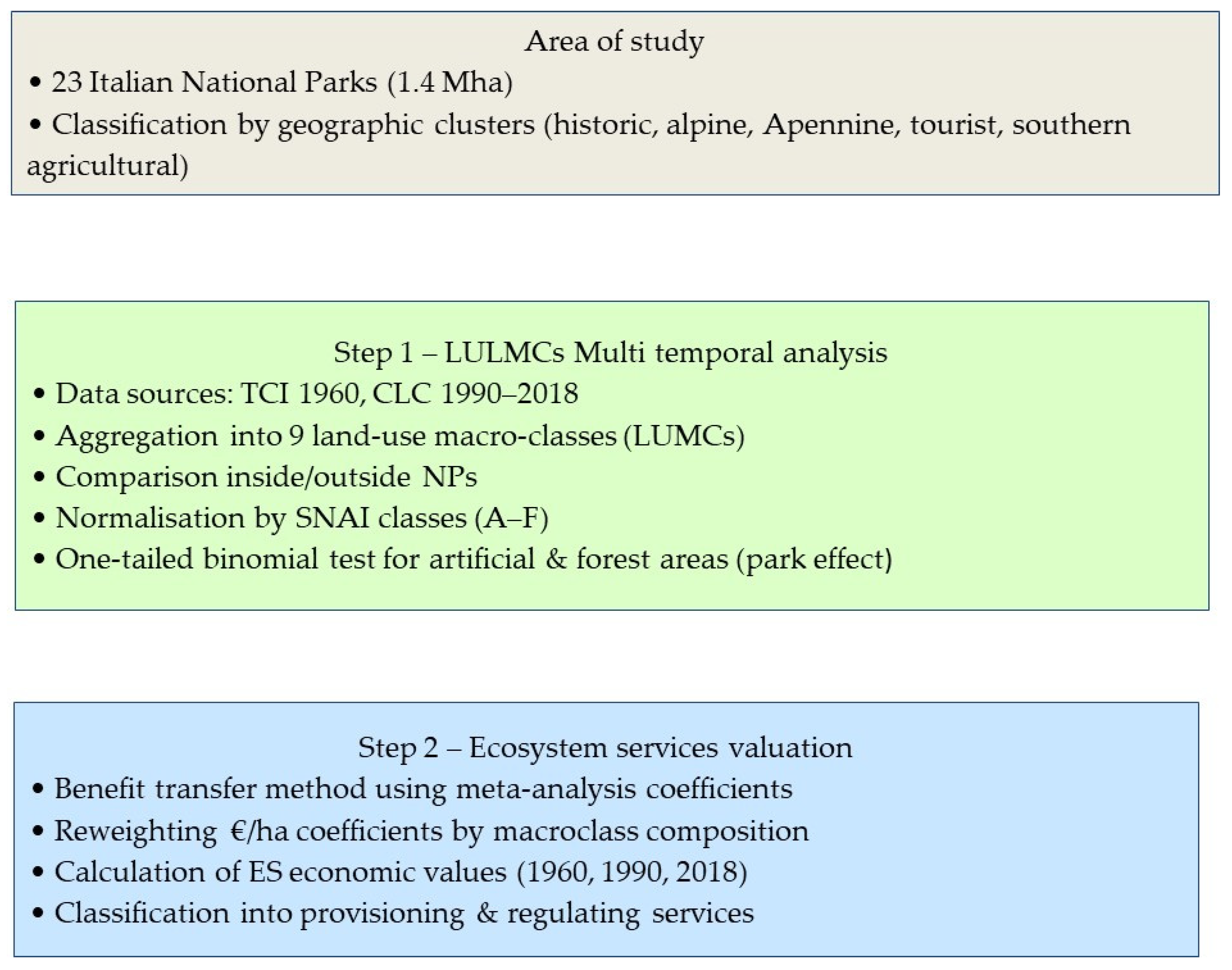 APA StyleMarino, D., Barone, A., Palmieri, M., Marucci, A., Giaccio, V., & Pili, S. (2025). Searching for the Park Effect: An Analysis of Land Use Change and Ecosystem Service Flows in National Parks in Italy. Land, 14(11), 2163. https://doi.org/10.3390/land14112163