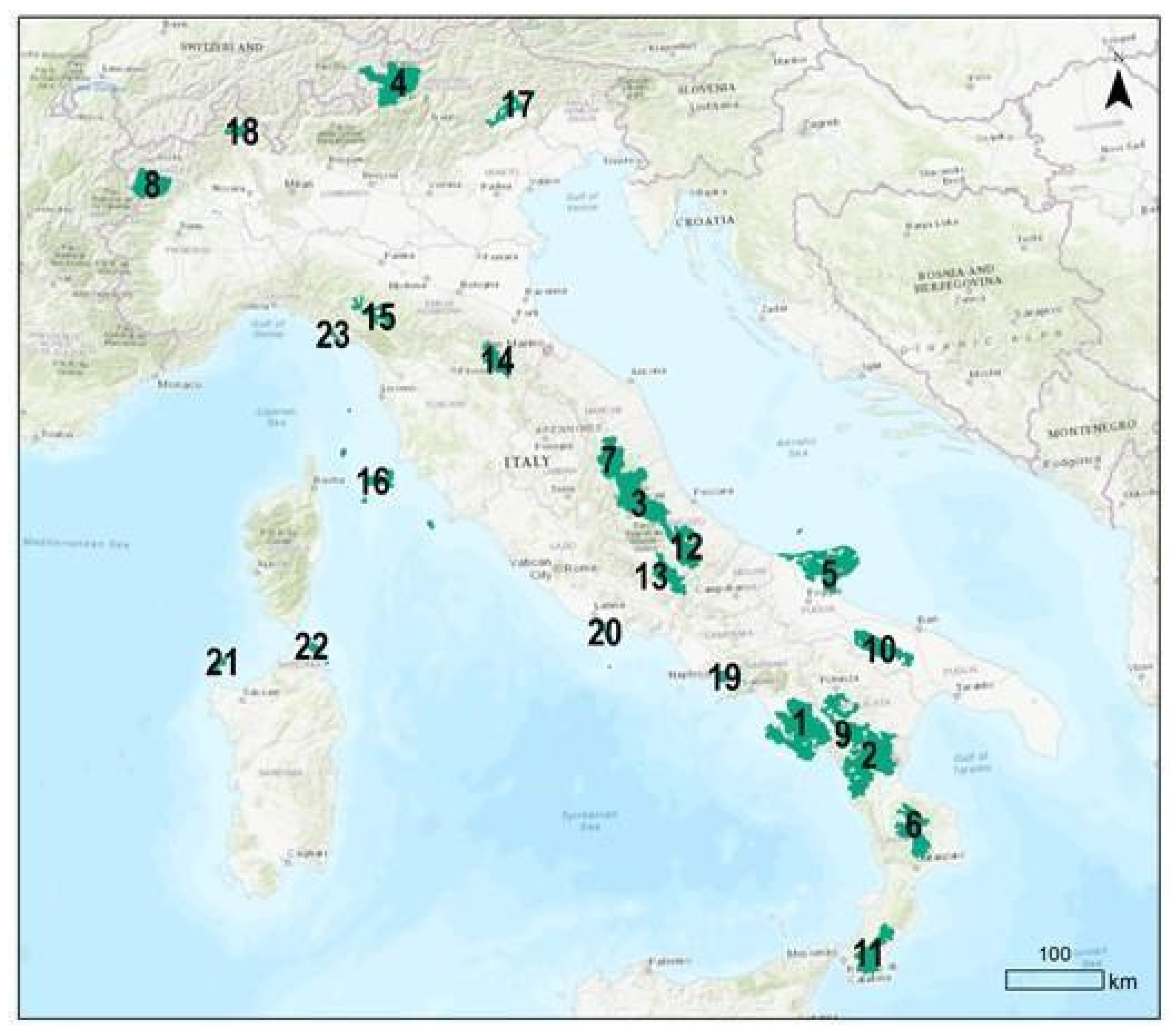 - MASE/Federparchi. Rapporto Sullo Stato Delle Aree Protette 2010–2021; Ministero dell’Ambiente e della Sicurezza Energetica & Federparchi: Roma, Italy, 2021. [Google Scholar]
