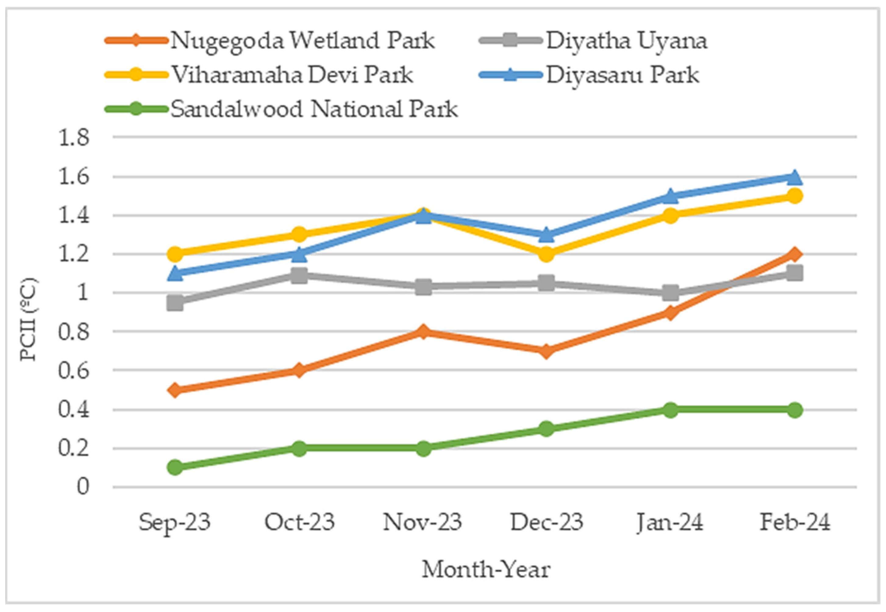 | Park | Area (ha) | Perimeter (m) | PCII (°C) | No. of Plots |